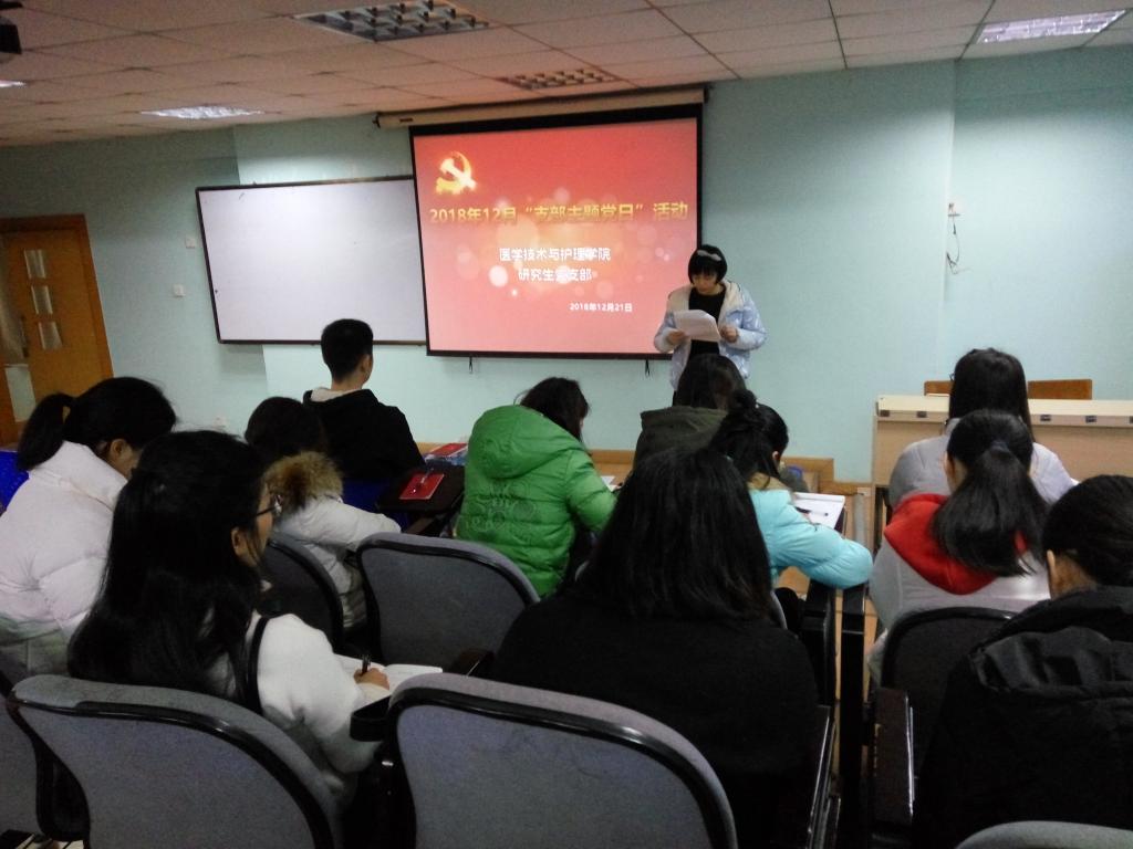 为深入领会《中国共产党支部工作条例(试行)》精神,全面掌握《条例》内容,切实增强贯彻执行《条例》的思想自觉和行动自觉。12月21日16:30,护理与医学技术学院研究生党支部在护训中心开展了“支部主题党日”活动,来自医护学院研究生支部的17级、18级党员及发展对象全体同志参加了本次活动。