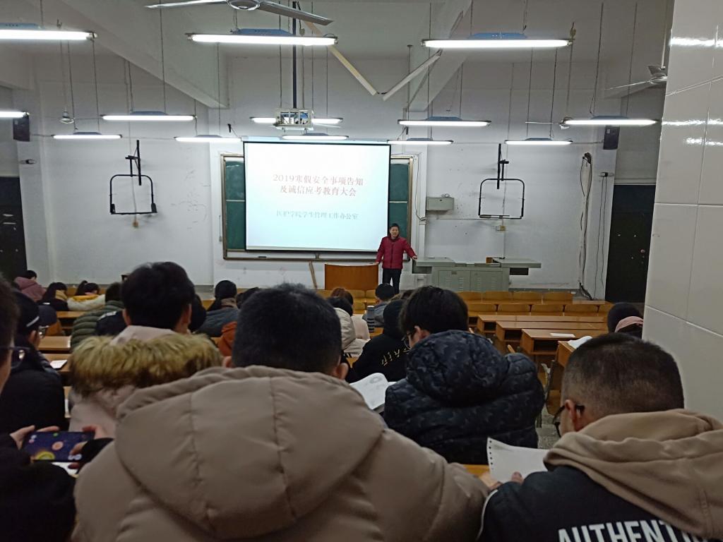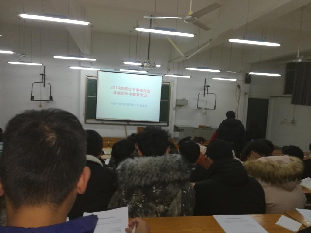 1月1日晚6点,学院在04电教室开展了寒假安全及诚信考试教育活动,该活动由学工办主任张昭雪主持,18级全体员工参加。