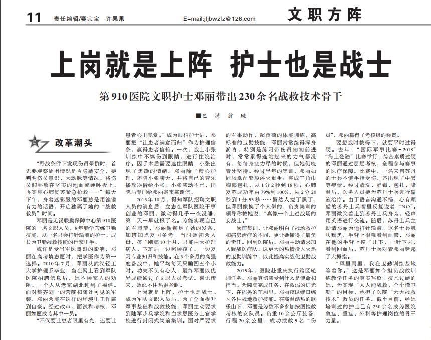 “风里雨里,我在卫勤训练基地等着你。”这是邓丽如今担负战救训练教学任务的真实写照。技术过硬的她,为实现“人人能战救,个个懂卫勤”的目标,承担了医院“六大战救技术”教员的任务。截至目前,经她培训过的护士已有230余名成为医院急症、重症、外科等护理岗位的骨干力量。