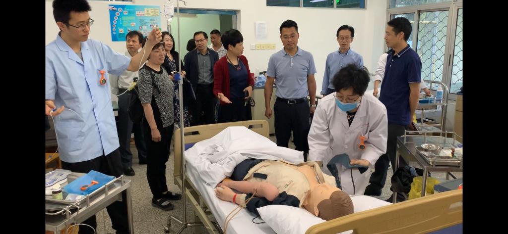 座谈会后,王志勇董事长一行参观了临床技能训练中心,看望了正为“全省护理本科院校教师临床技能竞赛”集训的老师。